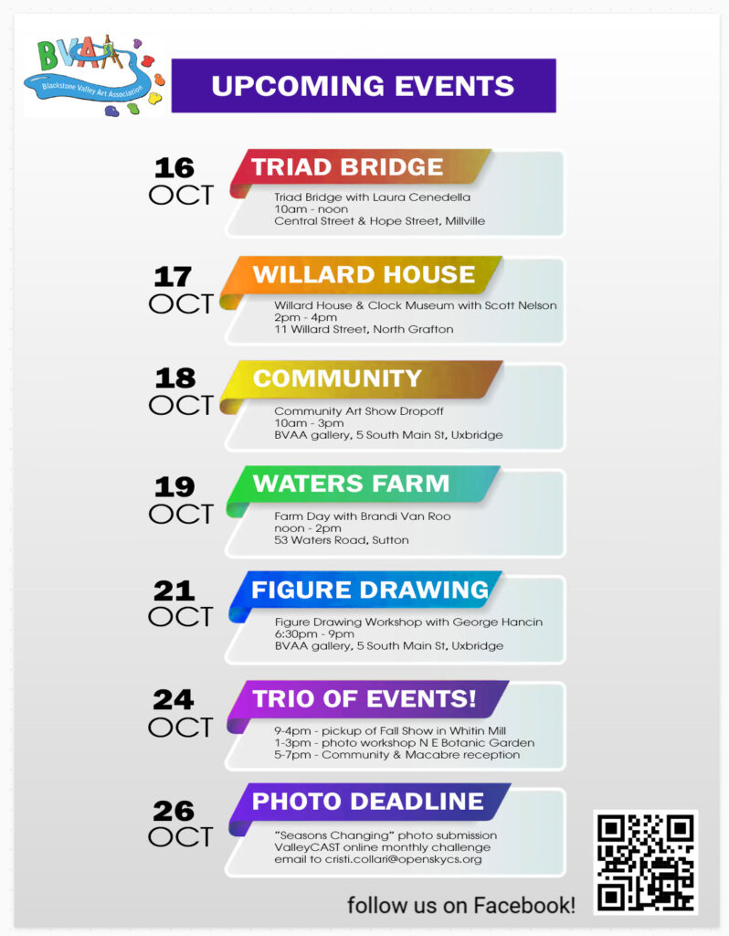 Happy October 2025! The Blackstone Valley Art Association has so many events going on in October that we’ve created a fridge flyer for you to refer to! Enjoy!