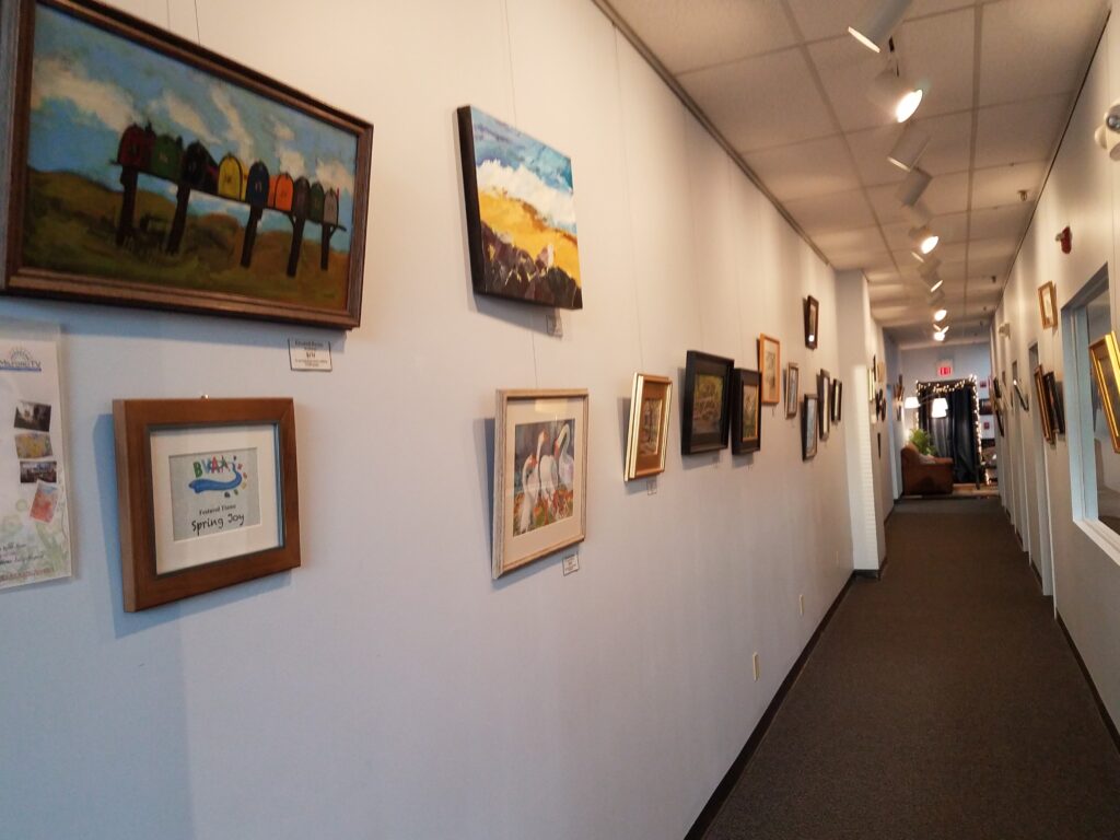 The Milford TV Station is an active public location which creates a wide variety of cable TV shows. People come and go quite often. Our gallery consists of the walls of their long hallways. This public showcase gives us the opportunity to make numerous social media posts about the art. The public can then stop by Milford TV any time they are available to see the art and buy it.