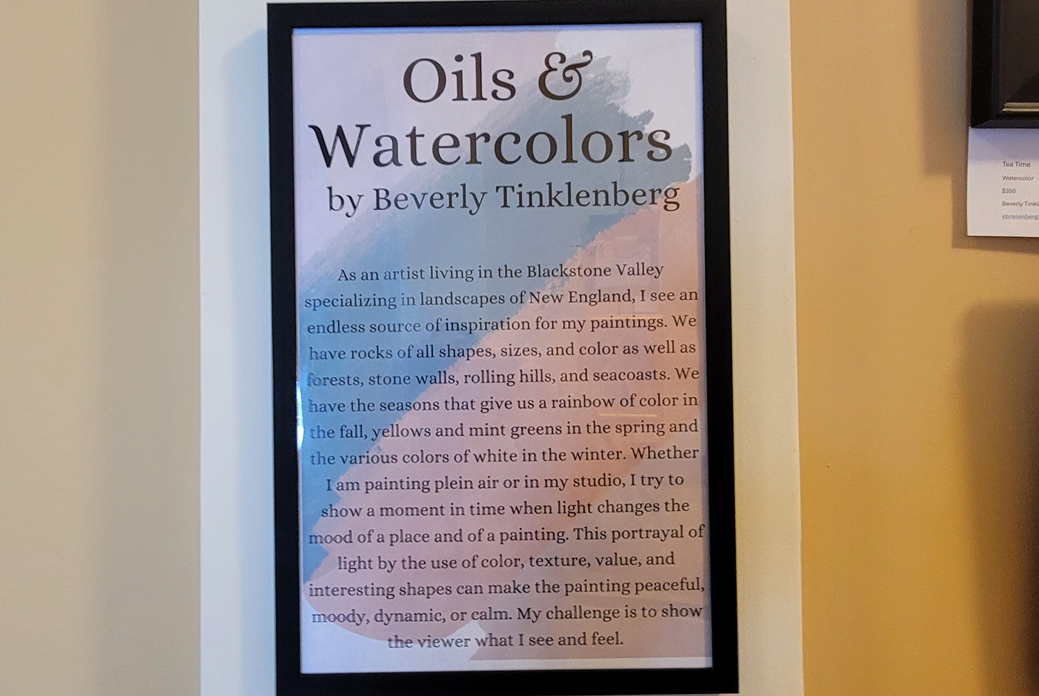 The artists are drawn from our Blackstone Valley Art Association. The poets are drawn from the Sutton Writing Group and the Worcester Writers Collaborative.