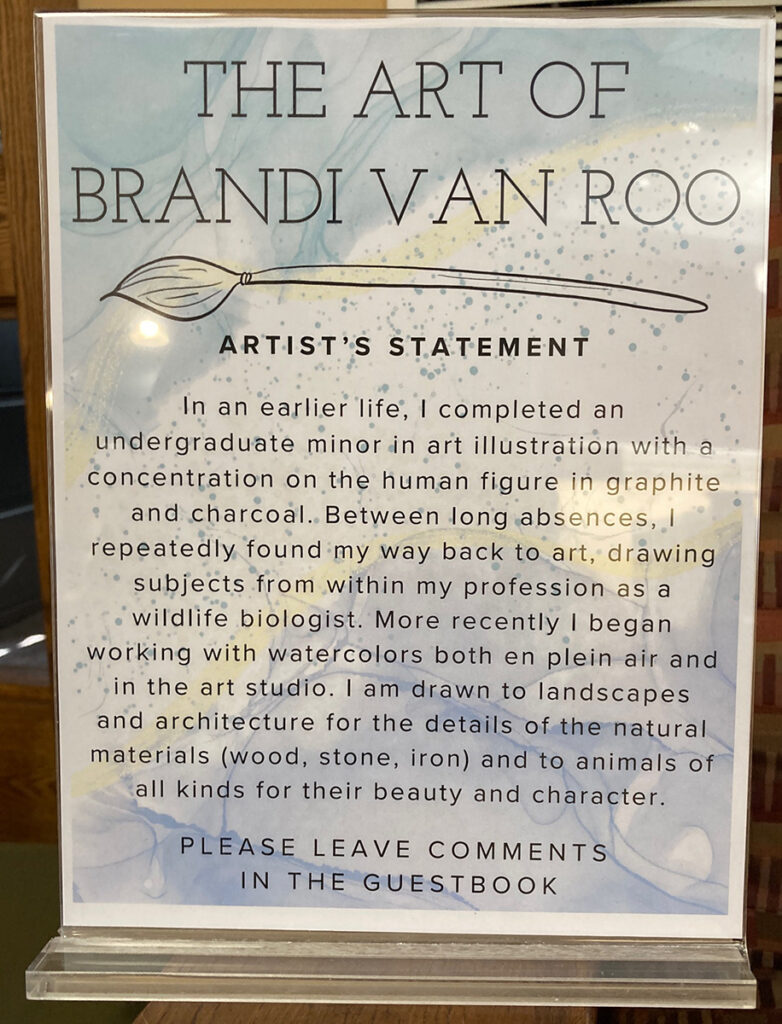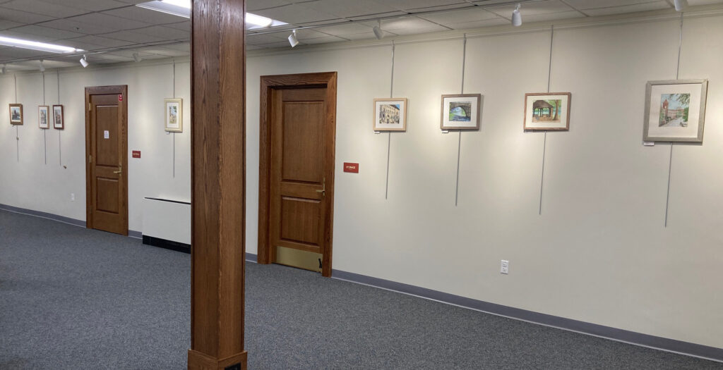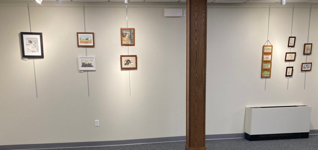 The Charlton Public Library also has a main meeting room which is in constant use. This is well suited for larger items. Here is Brandi Van Roo who is in the space in January 2026. You can see that the space works well for art items of all sizes. Note how Brandi has attached her labels to the bottoms of her artworks.