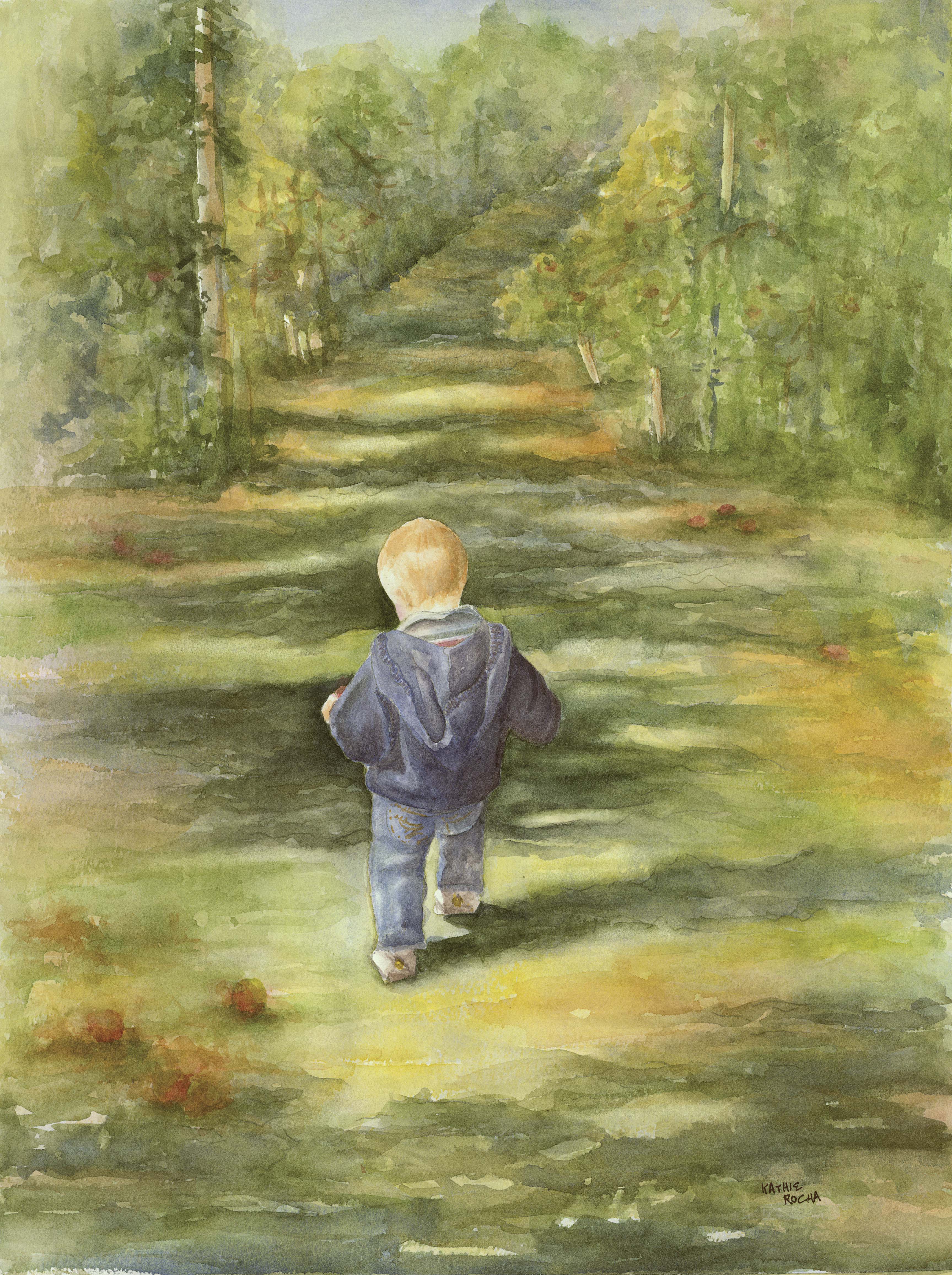 Being primarily a self-taught watercolorist, when I first began painting people, both adults and children, I feared inaccuracy, allowing myself only to paint my subjects from behind. Over time, as my fears began to subside, I began painting subjects in more traditional settings from multiple angles. I now enjoy the challenge of capturing tiny details in my work – the twinkle of an eye, the cheeky grin, or the warm glint of sunshine on a tiny head – and freezing that moment in time.